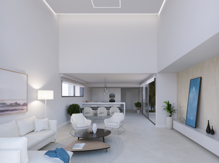 Distribución Espaciosa en Tres Niveles: El diseño de estas villas se extiende en tres niveles. En la planta baja, encontrarás un aseo de invitados, un dormitorio completo y un baño. La planta baja se destaca por una espaciosa cocina de planta abierta que se fusiona elegantemente con el comedor y la sala de estar. Grandes puertas de patio se abren hacia la terraza frontal y el área de la piscina, creando una conexión fluida entre el interior y el exterior.